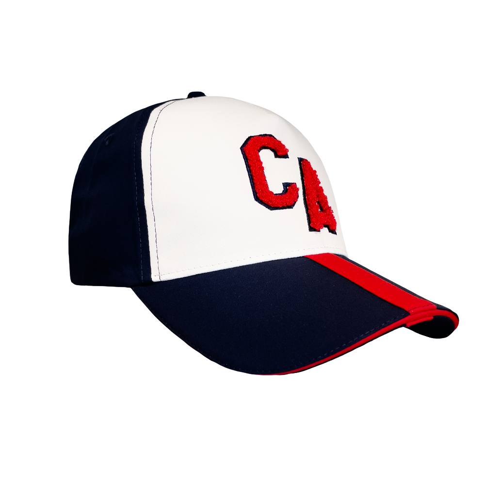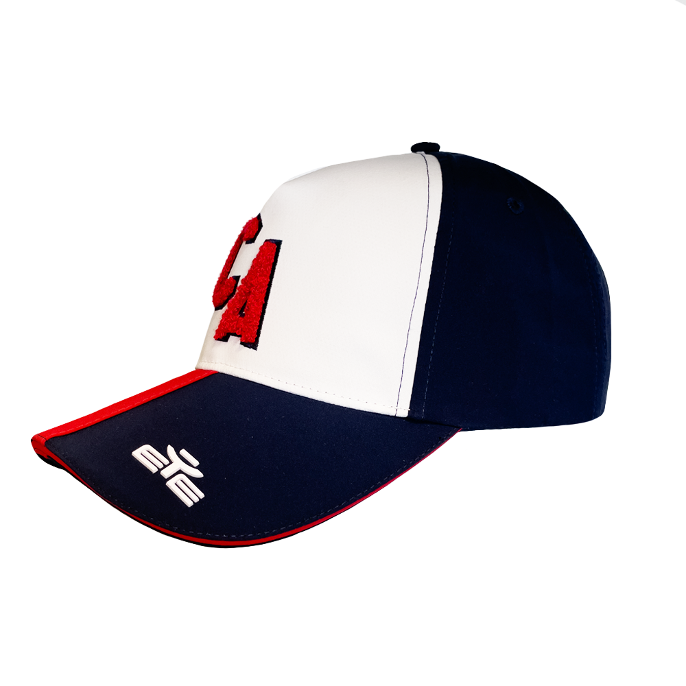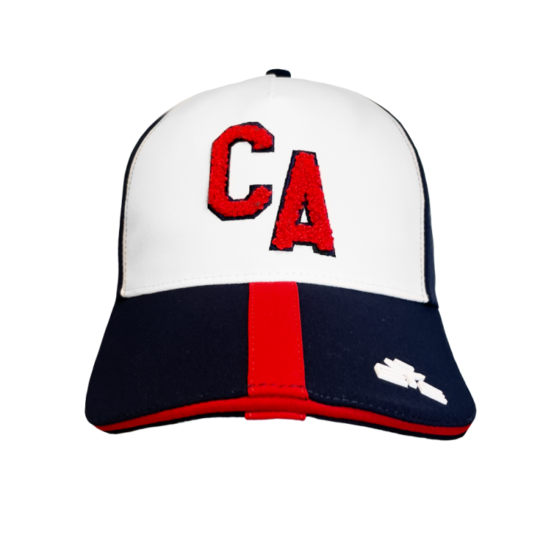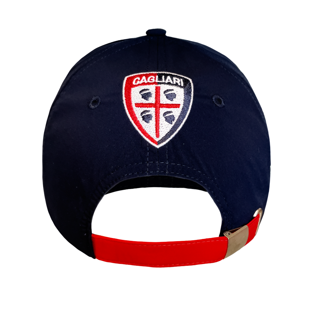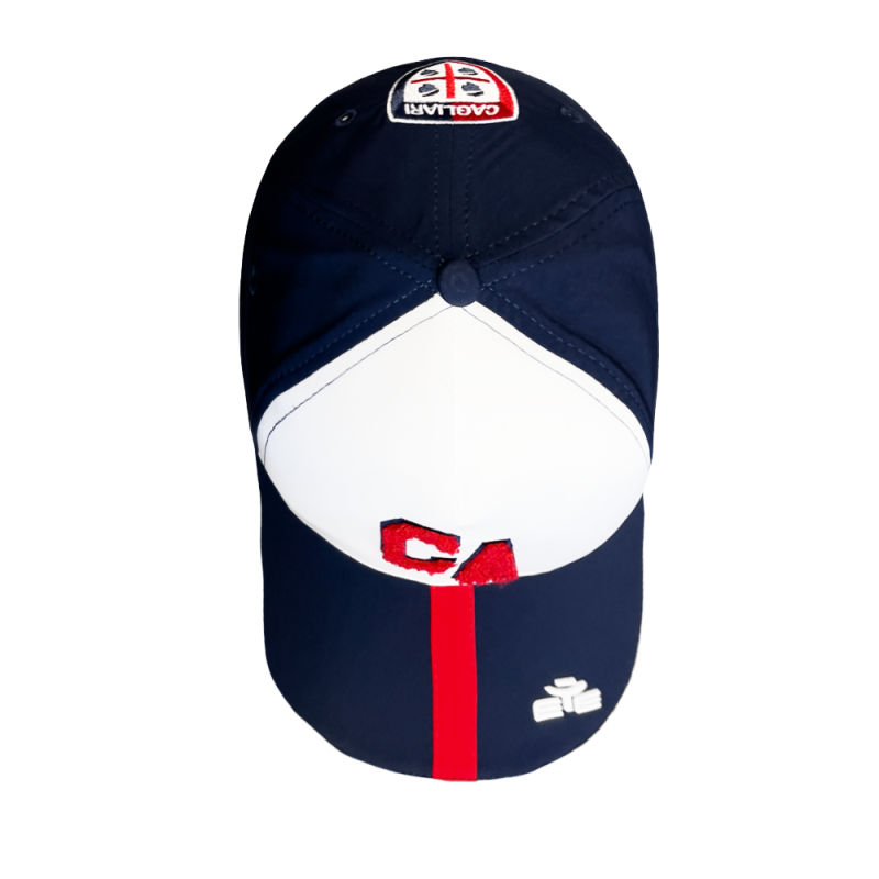 Patch chenille con scritta “CA” sul fronte. Logo EYE Sport in silicone applicato nella visiera e scudetto del Cagliari Calcio ricamato sul retro.