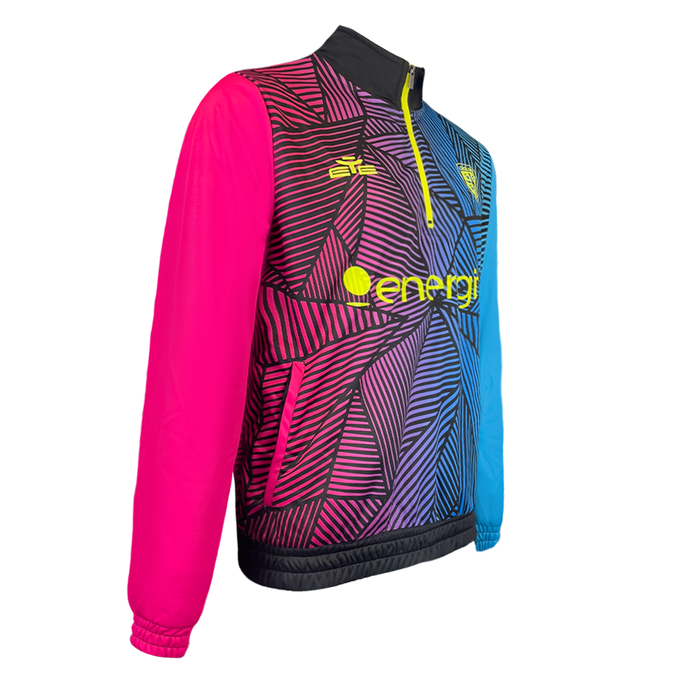 Mezza zip frontale giallo fluo con cursore personalizzato. Polsini e fondo elasticizzati. Tasche laterali con rinforzo bartack. Perfetta per un look sportivo e funzionale.