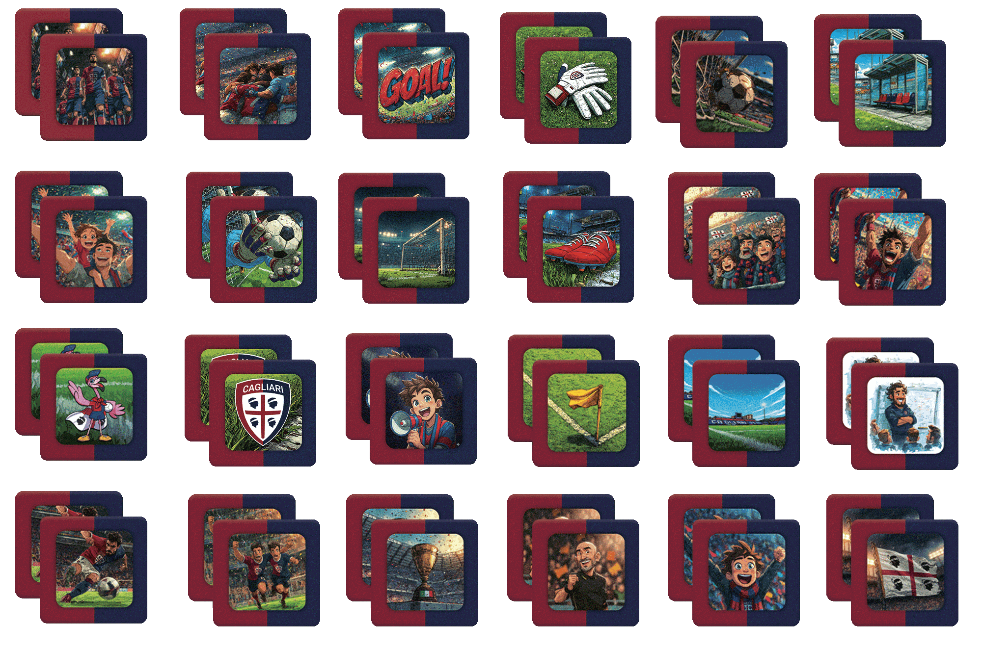 Il gioco di coppie più amato di sempre arriva in una versione speciale dedicata ai tifosi del Cagliari, perfetta per divertirsi in famiglia o con gli amici. Ogni tessera racconta un momento unico del mondo rossoblù: esultanze, azioni da gol, lo stemma ufficiale e i simboli più iconici della squadra. Realizzato con materiali di alta qualità e custodito nella sua scatola dedicata dal design esclusivo, questo memory unisce divertimento, emozione e orgoglio.