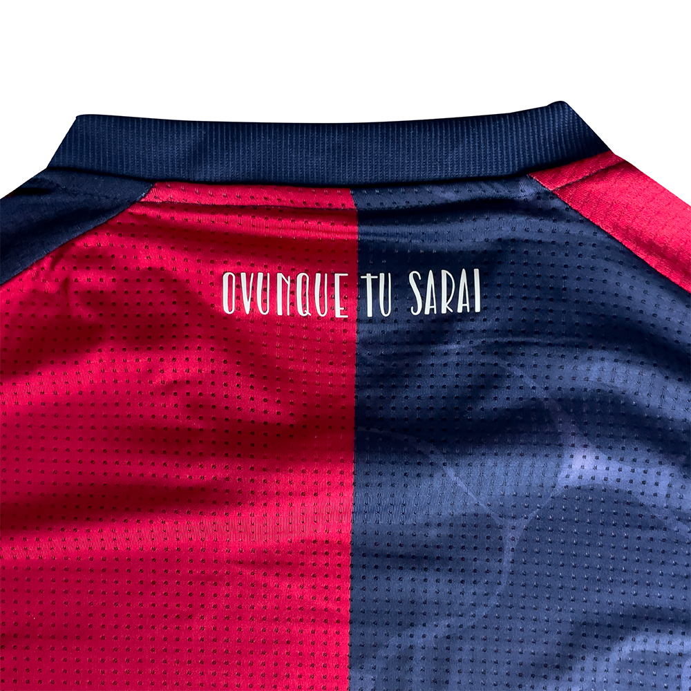 Scritta in silicone “Ovunque tu sarai” sul retro, omaggio ai cori dei tifosi rossoblù e nell’orlo il dettaglio delle coordinate geografiche del centrocampo dell’Unipol Domus: il cuore della casa rossoblù.