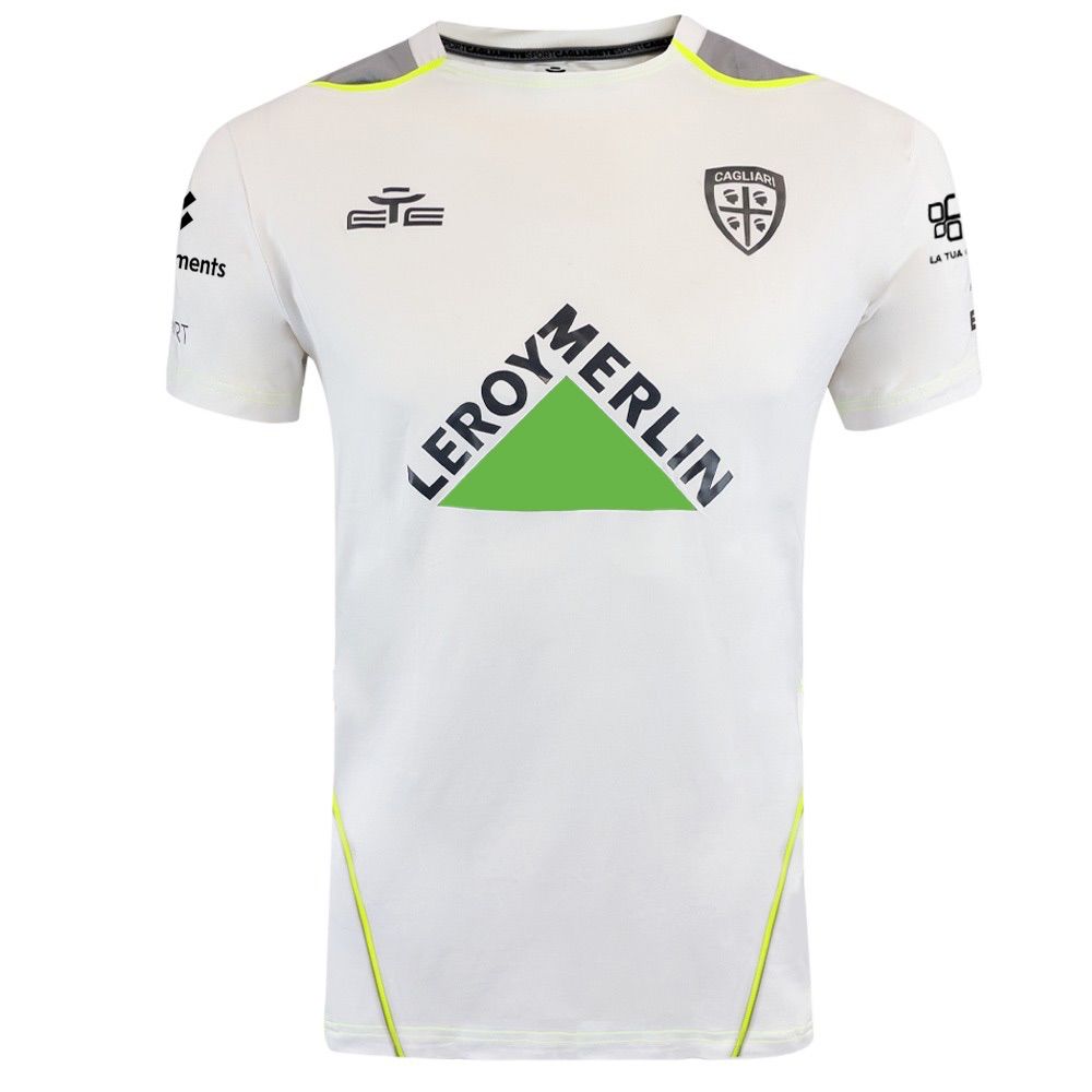 T-shirt bianca con pannello grigio a contrasto all’altezza delle spalle. Colletto a Girocollo con Tergisudore offre Praticità e comfort per un uso prolungato, personalizzato con le scritte “Cagliari Calcio” e “EYE Sport”